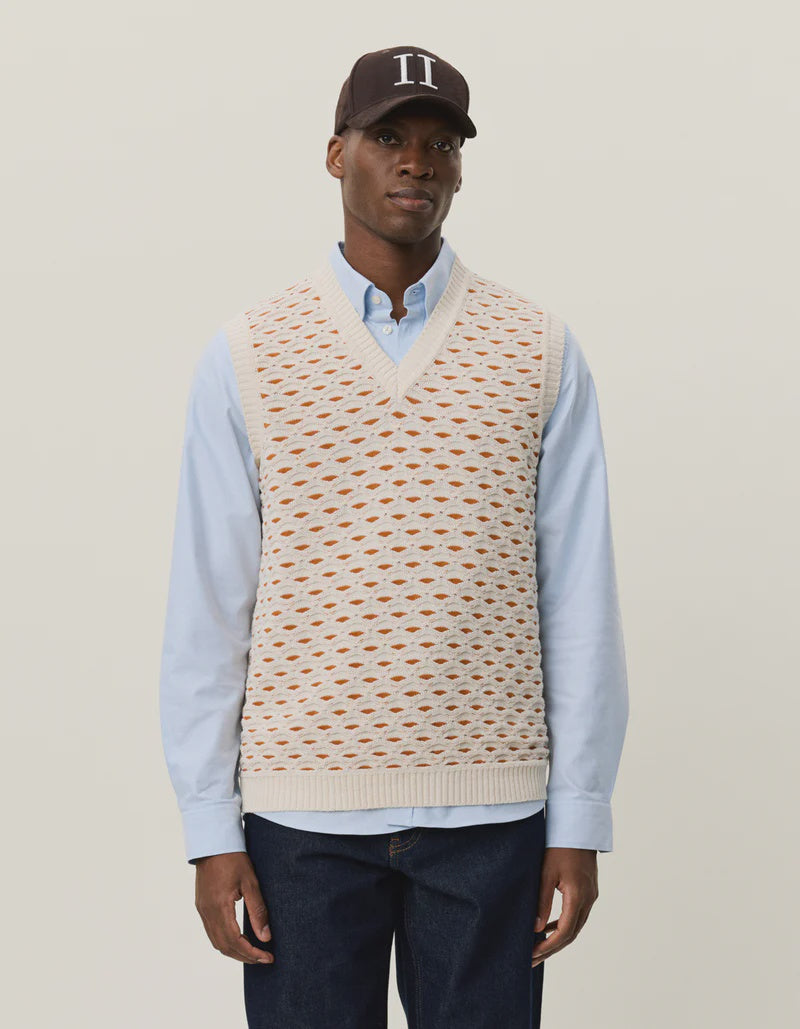 A patterned summer layer crafted in a structured shell knit. The Esmay Vest is finished with contrast coloring and ribbed trims, making it an easy piece to wear over shirts or tees.