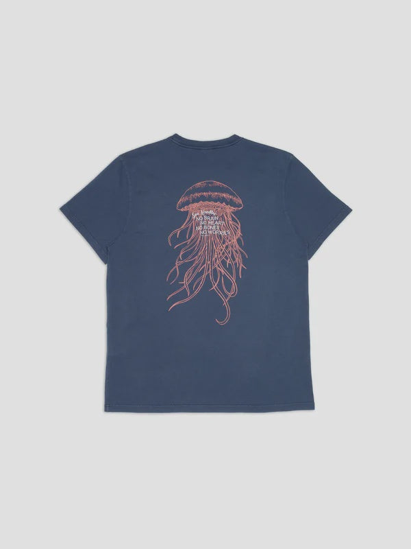 Crew neck tee made with organic cotton. The open-end spun yarn gives an open knit with an irregular character, a dry hand, and a little hairiness. The faded shade and vintage look result from the garment dye and, on top of that, a fade-out wash. This gives the lived-in outlook we think goes so well with denim. The color will continue fading as you wear and wash it. Print on the chest and back.
